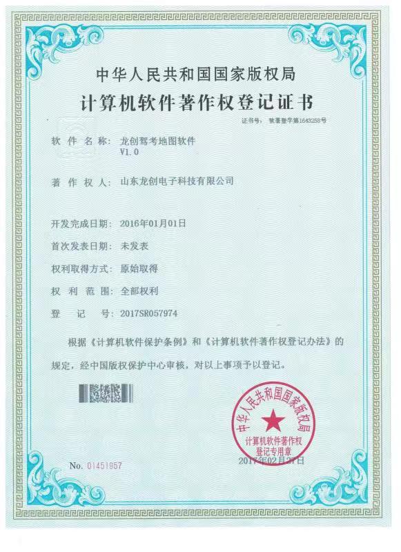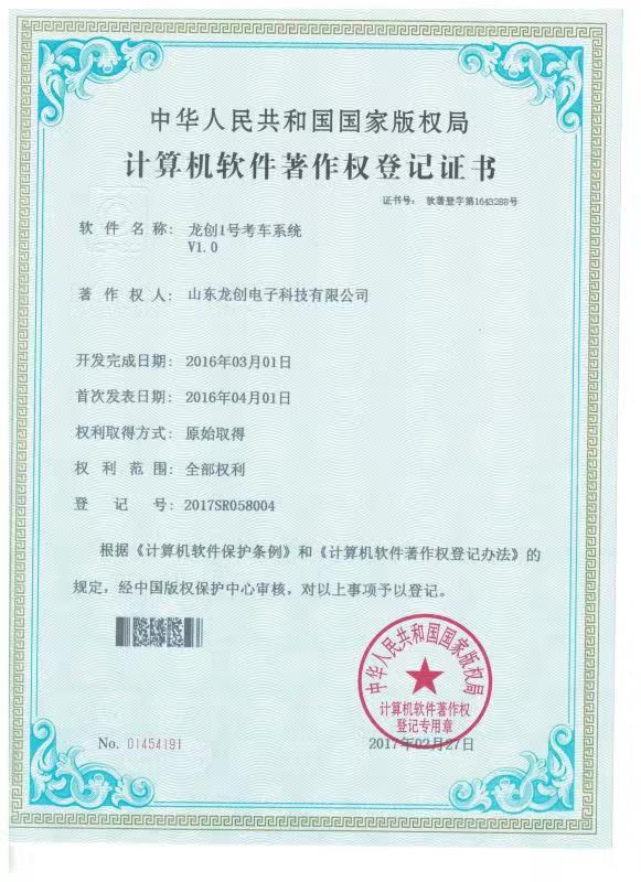 龍創(chuàng)1號考車系統(tǒng)V1.0 計算機軟件著作權(quán)登記證書