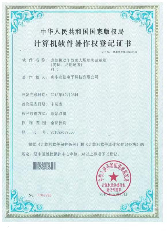 龍創(chuàng)機(jī)動(dòng)車(chē)駕駛?cè)藞?chǎng)地考試系統(tǒng)V1.0 計(jì)算機(jī)軟件著作權(quán)登記證書(shū)